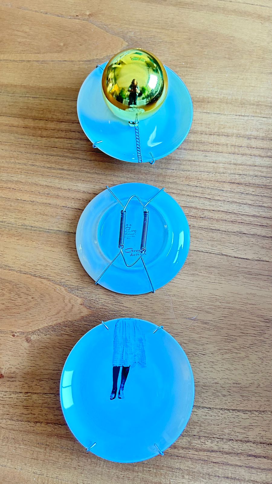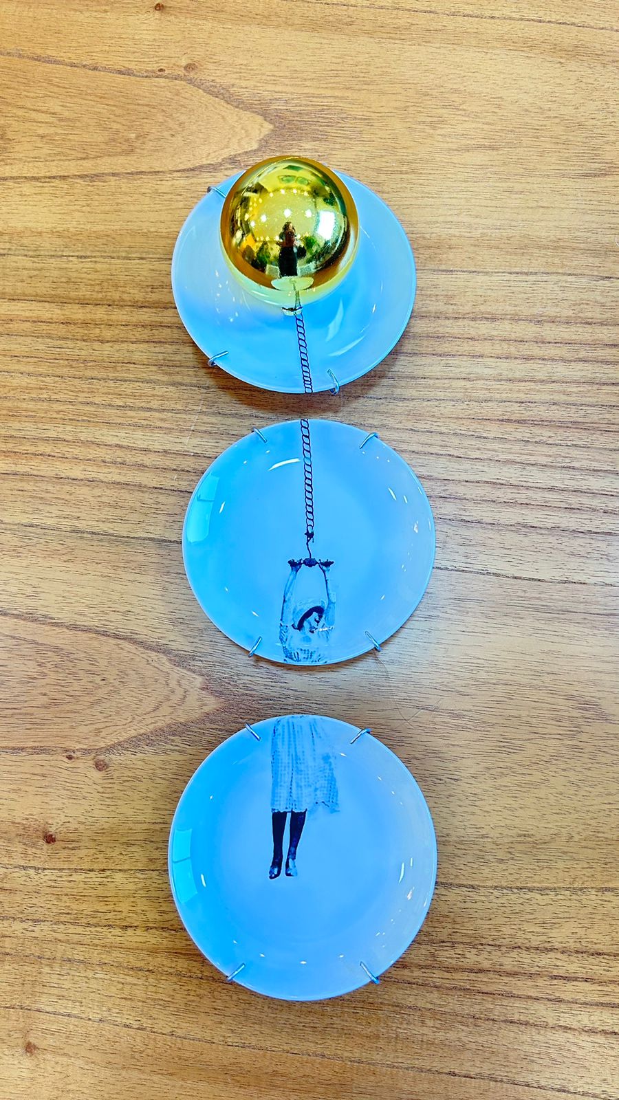 Cj. de 3 pratos de 10cm cada. Acompanha suporte para pendurar.